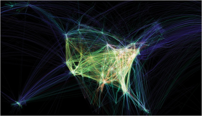 “Decode” ends with “Network,” which examines the interconnections of mobile technologies and the Internet. It also illustrates how digital imagery is helping us to make sense of a frenzied, often confusing world. Take Aaron Koblin’s “Flight Patterns,” which shows a real-time image of the aircraft flight paths over the United States, something that changes so rapidly that it would have been impossible to depict in any other medium.